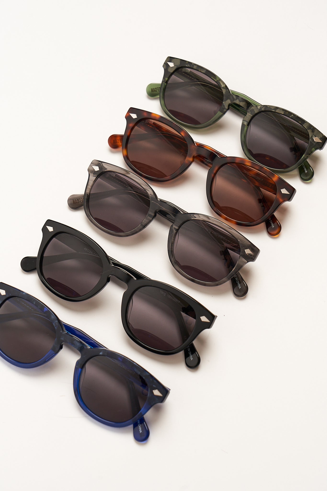 CR39 lenses in vintage-inspired light tints feature an anti-reflective coating and 100% UVA/UVB protection. Handcrafted from layers of custom designed acetate in exclusive colors that result in the unique pattern of each individual frame. Custom SEFSAN logo insignia at the temple tip assures authenticity. Decorative custom plaques enhance the design.